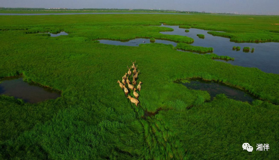 麋鹿群奔跑在東洞庭湖國家級自然保護區內。