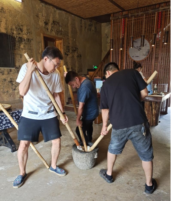 走進一棟民宿,幾個年輕人正掄起粗木棒、喊著號子打糍粑,加入黃豆粉、花生碎后,再分條、切塊,可口的非遺美食糍粑就新鮮制成。