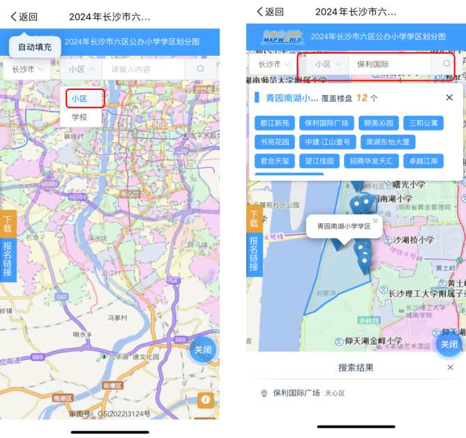 進(jìn)入服務(wù)后,點(diǎn)擊左上角選擇區(qū)域,并輸入學(xué)校的名字,點(diǎn)擊查詢按鈕后,即可看到對應(yīng)搜索結(jié)果,選擇對應(yīng)的學(xué)校,即可查看該學(xué)校覆蓋的樓盤名稱。