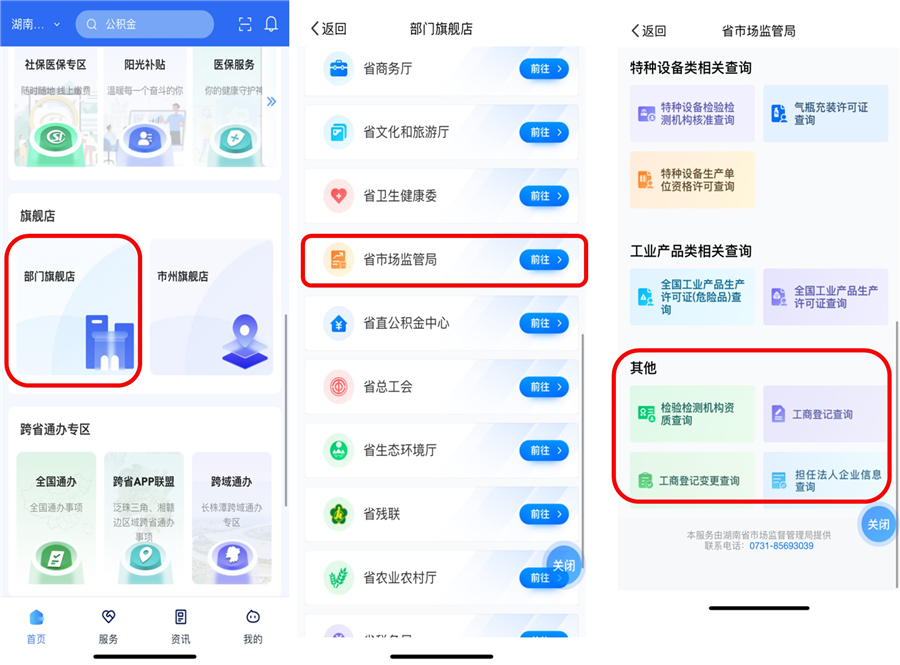 登陸“湘易辦”后,在首頁“部門旗艦店”中選擇“省市場監督管理局”,在“其他”欄目中點擊對應服務名稱即可進入;或在首頁直接搜索相應服務名稱進入。