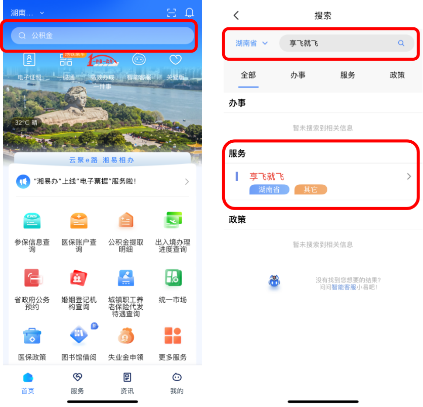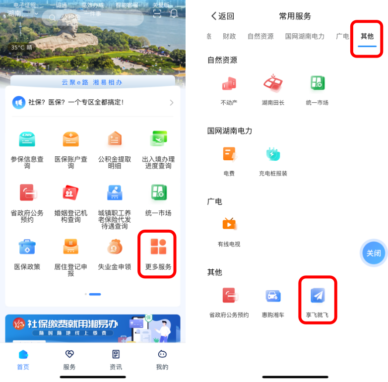 登陸“湘易辦”APP后,在首頁搜索“享飛就飛”,或在首頁金剛區選擇“更多服務”,選擇“其他”,找到“享飛就飛”,點擊即可進入服務。