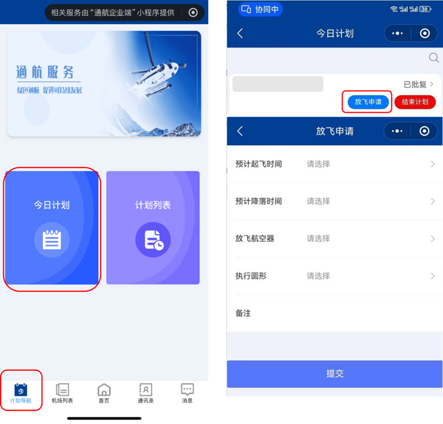 點擊“放飛申請”進入申請操作頁面,選擇起降時間,執行航空器,以及執行區域,如有其他信息可在“備注”中填寫,提交即完成放飛申請工作。